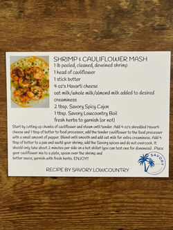 Start by cutting up chunks of cauliflower and steam until tender. Add 4 oz's shredded Havarti cheese and 1 tbsp of butter to food processor, add the tender cauliflower to the food processer with a small amount of pepper. Blend until smooth and add oat milk for extra creaminess. Add 4 tbsp of butter to a pan and sauté your shrimp, add the Savory spices and do not overcook. It should only take about 2 minutes per side on a hot skillet (you can test one for doneness) . Place your cauliflower mix to a plate, spoon over the shrimp and butter sauce, garnish with fresh herbs. ENJOY!!